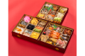 煮しめ、花人参(にんじん)煮、梅麩(ふ)煮、牡蠣の柚子味噌和え(広島県産)、穴子の山椒煮、ペッパーハム、数の子、鰤(ぶり)照焼(国産)、蛸(たこ)照り焼き、焼き海老、葉付きんかん、ローストビーフわさび醤油ソース